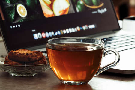 Glass cup with tea and cookies on a office desk with a laptop Tea break from loved job. Work online or offline or in office, freelancer job
