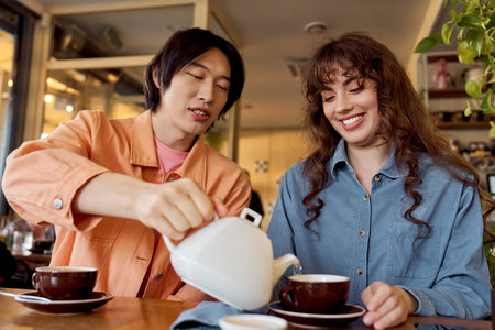 Two friends share a joyful moment while pouring tea in a vibrant cafe setting.