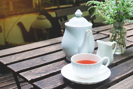 Tea time on wooden table in cottage garden