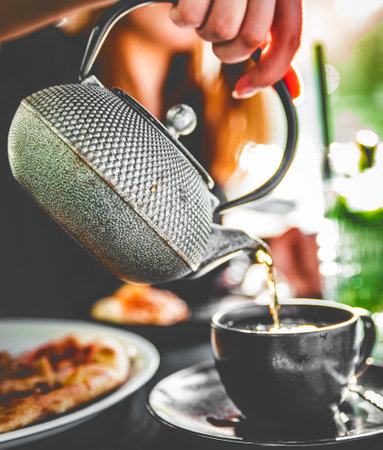 woman hand with metal teapot pour black tea in black glass cup in cafe