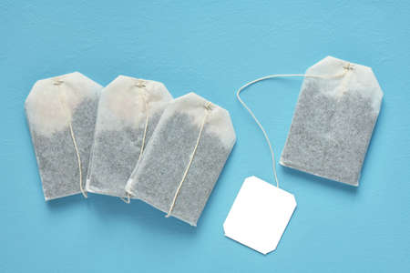 Tea bags in ceramic cup of hot water on white wooden table, flat lay. Space for text