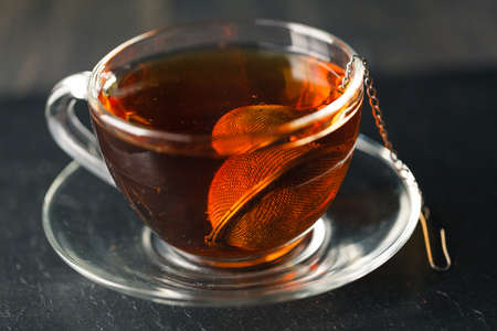 A cup of hot, black tea in a glass cup on a gray ceramic countertop.