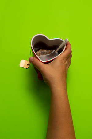 A cup of tea with a heart. Minimal flat lay. composition on pastel green backgrounds.