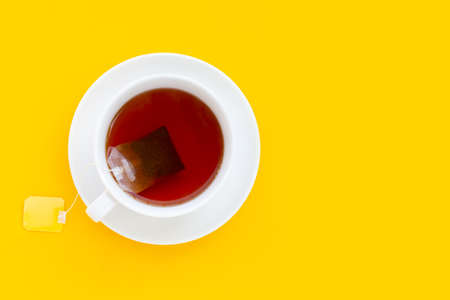 A cup of black tea in a ceramic yellow cup with dry tea scattered on a yellow background. Copy space. Top view.