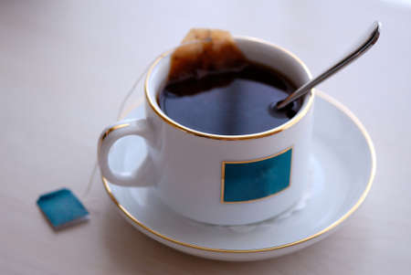 Two cups of black leaf tea in kept on a table with tea bags inside the cups