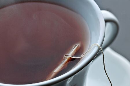 Teabag steeping in boiling water in a teacup during the brewing of a relaxing cup of tea over a white background