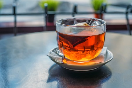 A clear glass mug filled with hot black tea and a tea bag steams gently. A spoon rests inside.