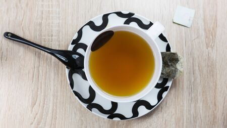 Cup with tea and tea bags on a brown wooden table. top view with space for text