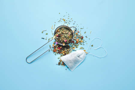 tea in a white cup, a wooden spoon, scattered with half-breasted leaf tea on a turquoise blue background. place for text, mocap. Tea pack option. top view
