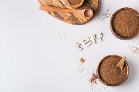 Teff, an alternative to ancient gluten-free grain with the name written in wooden letters. Teff has become a popular choice for healthy eating.