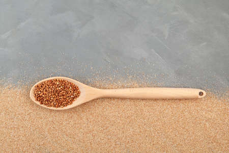 Organic buckwheat in wooden spoon on gray textured background. Buckwheat flour (ground grits) or flake. Top view, selective focus.