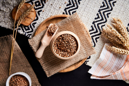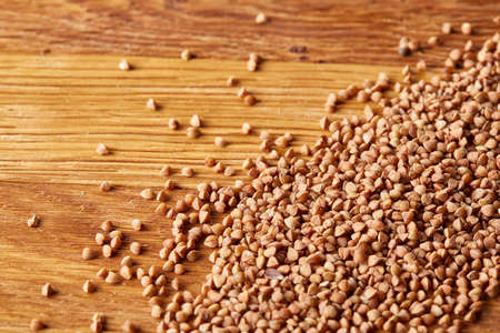 Buckwheat groats on wooden background, top view, close-up, selective focus. Some copy space for your text. Premium cereal for healthy eating or dieting. Healthy food concept.