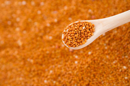 red millet grains with in wooden spoon.