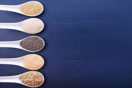 Grains including, white grain quinoa, psyllium husk powder, black chia, wheat germ, and ground LSA mix, on dark blue wood grain table, with copy space.