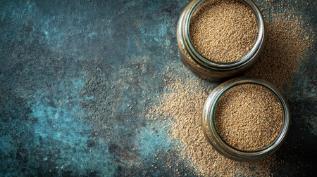 Two glass jars filled with brown seeds sit on a textured, rustic surface, showcasing natural ingredients ideal for cooking or baking. Perfect for culinary themes.
