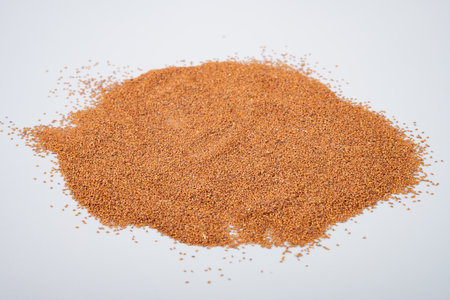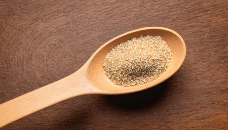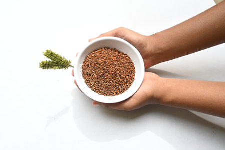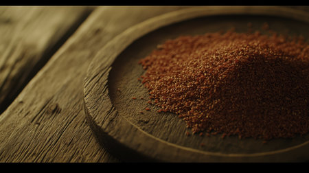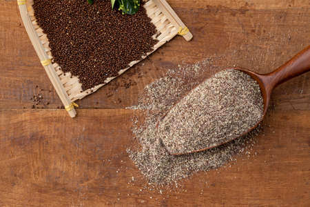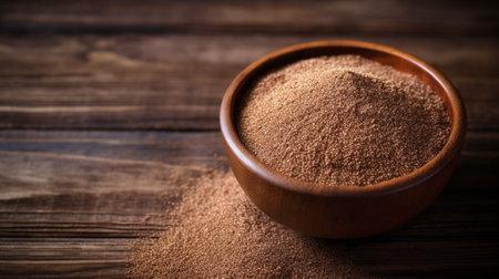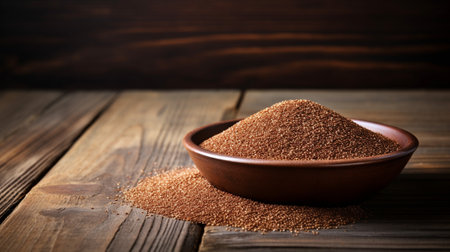 Explore the exquisite details of Teff grain in this studio photograph. Captured with perfect lighting against a rustic wood backdrop, this image provides ample copy space for your creative projects