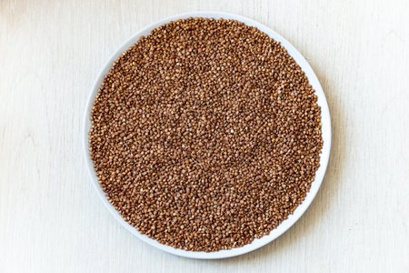 top view buckwheat grain in bowl on white background,