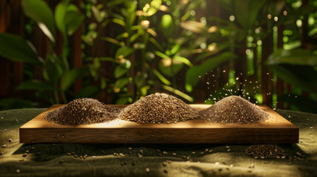 Envision a scene featuring three soulful food products--cacao, chia seeds