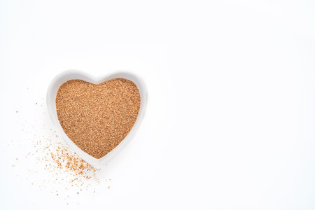Jerusalem artichoke fiber in bowl of the shape of heart isolated on white background, top view
