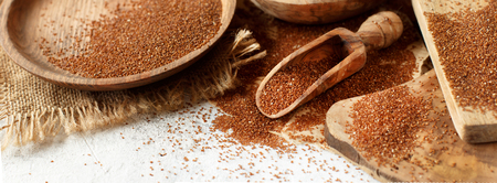 Teff, gluten-free alternative to ancient grains, is popular choice for healthy diet. Burlap and wooden dishes, from natural product Eco friendly and sustainable concept.