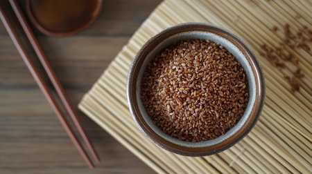 A shot of dry brown short-grain rice in a bowl, placed next to a bamboo mat and chopsticks for an Asian-themed presentation.