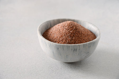 Indian Black salt, Kala namak in blue bowl on gray background. Close up. Ideal seasoning for Indian cuisine. Useful for vegetarians as a source of iron.