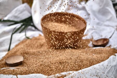 Organic brown rice in weave rattan basket trays