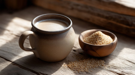 A serene image showcasing a bowl filled with grains, beautifully illuminated by sunlight streaming through a window, highlighting texture and warmth.