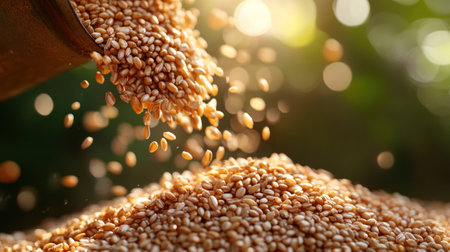 A closeup view of sesame seeds falling from a spoon into a bowl, emphasizing the beauty of natural ingredients perfect for healthy cooking and baking.