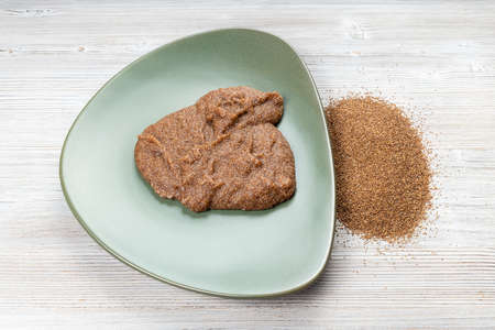 teff grains and boiled porridge on green plate on wooden table