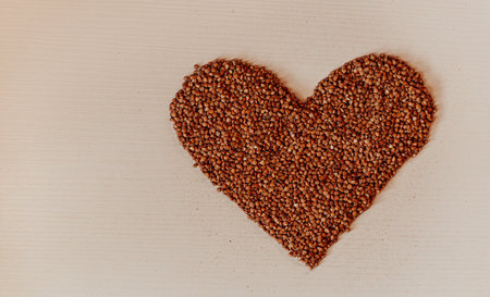 An overhead closeup shot of a heart-shaped pile of buckwheat lying on a white surface