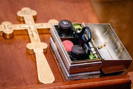Jewish ritual objects, prayer vestments, Tefillin with a hebrew inscription - the arm tefillin and the head tefillin. Toned image
