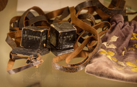 Teffilin or phylacteries. Two old small dark leather cubes with scrolls inscribed of verses from Torah, are worn by devout Jews during weekday morning God blessing. View closeup with space for text