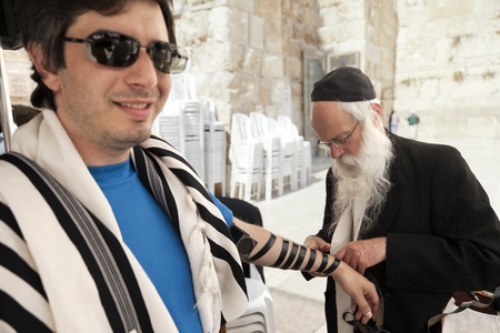 Jerusalem, Israel - May 9th, 2012: An adult Caucasian man wearing a praying shawl , while being helped by a Rabbi with putting on the Phylacteries (Teffilin, Tefilin, Tfilin). This man is a Jewish tourist visiting the holy Western Wall (aka Wailing Wall)