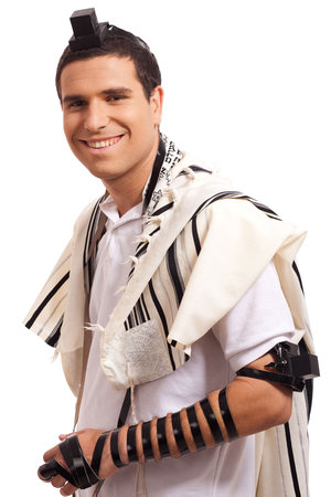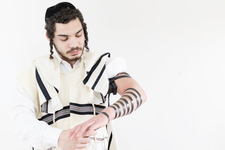 A young Orthodox Jew in shawl (tallit) putting on phylacteries (tefillin) on left arm against a white background
