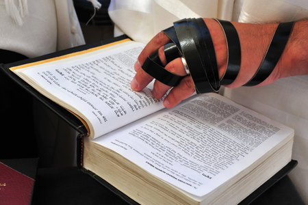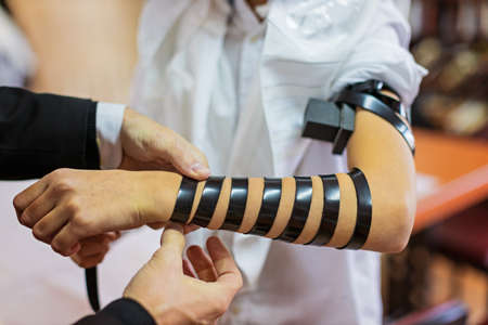 Detail of a moment when a Jewish rabbi puts tefillin on the arm of a thirteen year old boy to say a prayer before the bar mitzvah