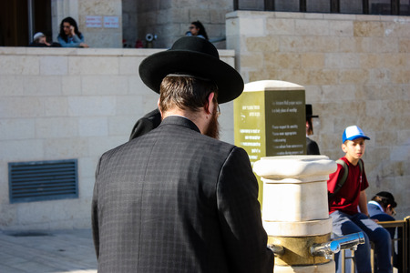 Jerusalem Israel May 14, 2018 unknown religious people in front of the public fountain on the Western Wall Square in Jerusalem