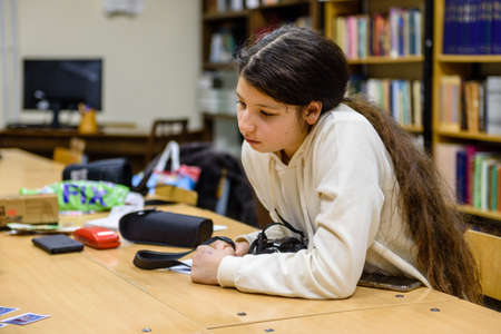 Russia St. Petersburg November 2021: A young woman in the classroom listens to photo courses