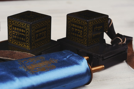 Pair of tefilim with torah on white wooden background. Jewish lifestyle concept