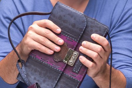 Close up, young men reading Jewish prayer and a hand with tefillin and talit.Selective focus