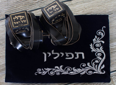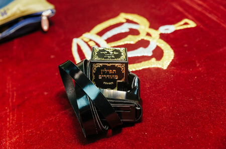 Tefillin. background of a prayer shawl Bar Mitzvah