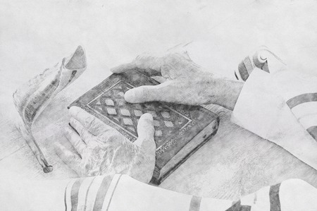 Abstract background of Old Jewish man hands holding a Prayer book, praying, next to tallit and shofar (horn). Jewish traditional symbols. Pencil sketch painting style