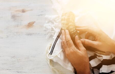 religion image of white prayer talit. Rosh hashanah (jewish New Year holiday), Shabbat and Yom kippur concept