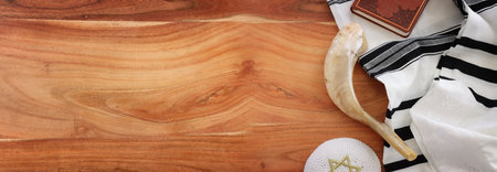 religion image of Prayer Shawl - Tallit, Prayer book and Shofar (horn) jewish religious symbols. Rosh hashanah (jewish New Year holiday), Shabbat and Yom kippur concept. banner