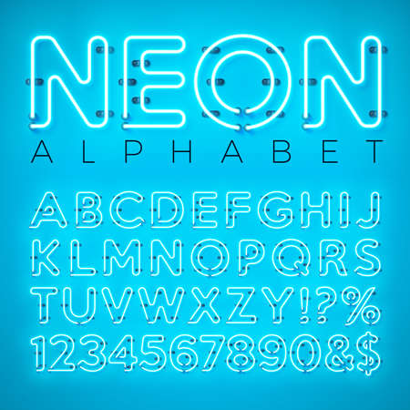 Bright Neon Alphabet on Blue Background. Vector Letter, Number and Symbol with Shiny Glow Effect Layered Separated Characters. Font Design template for Your Text, Decoration, Banner, Flyer or Promotional Party Poster.