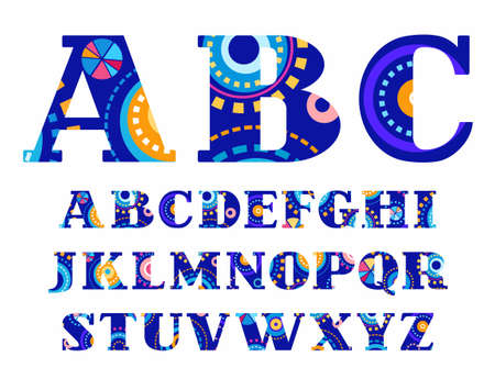Carnival, English alphabet, vector font, capital letters. The letters of the English alphabet with serifs. Colored circles on blue background. Pattern like fireworks.