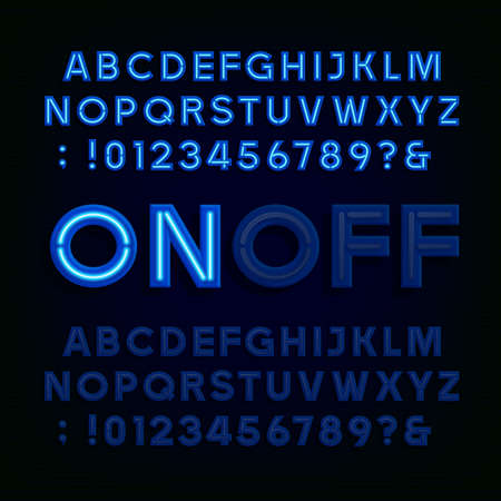 Blue Neon Light Alphabet Font. Two different styles. Lights on or off. Type letters, numbers and symbols. typography for animation, labels, titles, posters etc.