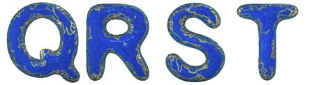 Realistic 3D letters set Q, R, S, T made of gold shining metal letters. Collection of gold shining metallic with blue paint symbol isolated on white background
