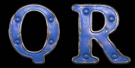 Set of uppercase letters Q, R made of painted metal with blue rivets on black background. 3d rendering