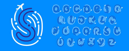Alphabet made of fingerprint with plane and airplane trail. Blue and white line . Vector typeface for travel labels, tourism headlines, journey posters, aviation cards etc.